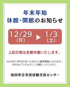 池田市立市民活動交流センターは、次の日程について年末年始休業いたします。 2023年12月29日(金)から2024年1月3日(火)まで 2024年は1月4日(木)より通常開館となります。2024年もどうぞよろしくお願いいたします。 施設情報 SNSで記事をシェアしてください! URLをコピーしました! 2階にフリーWi-Fiを設置! 関連記事 2025~2026年末年始 休館および開館のお知らせ 2025年12月25日 オンライン貸室予約がスタート! 2025年8月16日 【クールシェアスポット】 2025年6月19日 2024-2025 年末年始 休業および開館のお知らせ 2024年12月24日 2階にフリーWi-Fiを設置! 2024年6月30日
