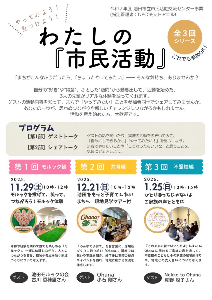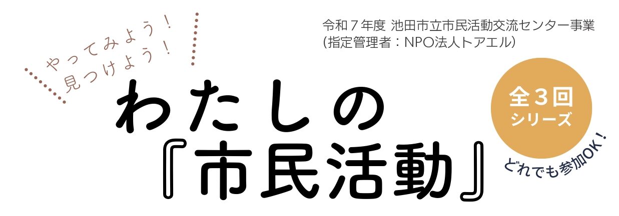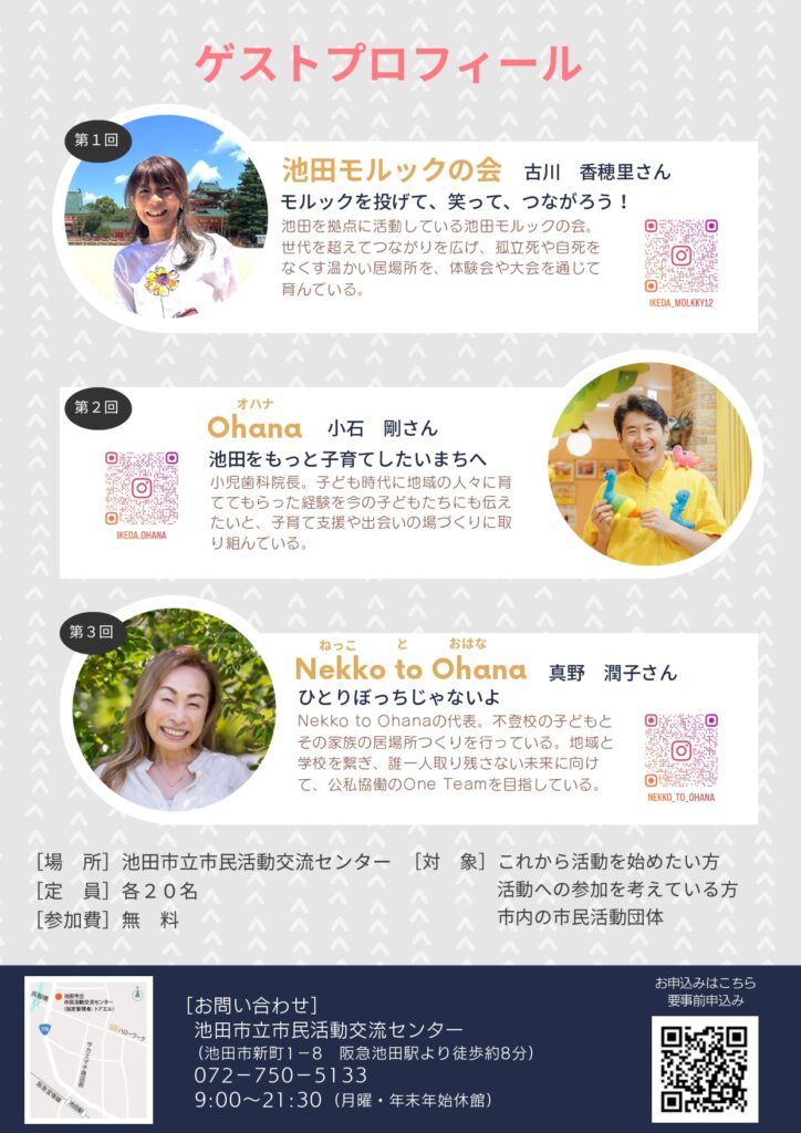 今回の市民企画講座では、池田市内で活躍する方が活動を始めたきっかけや、続ける中でのリアルな想いを語ってくれます。