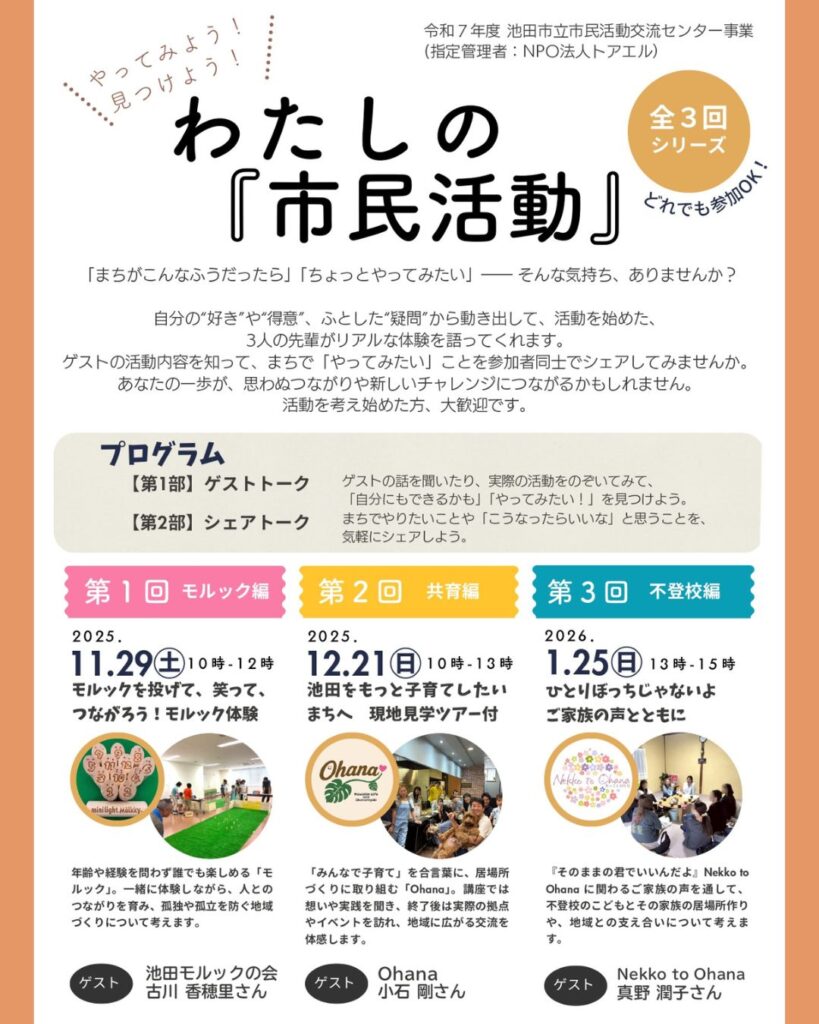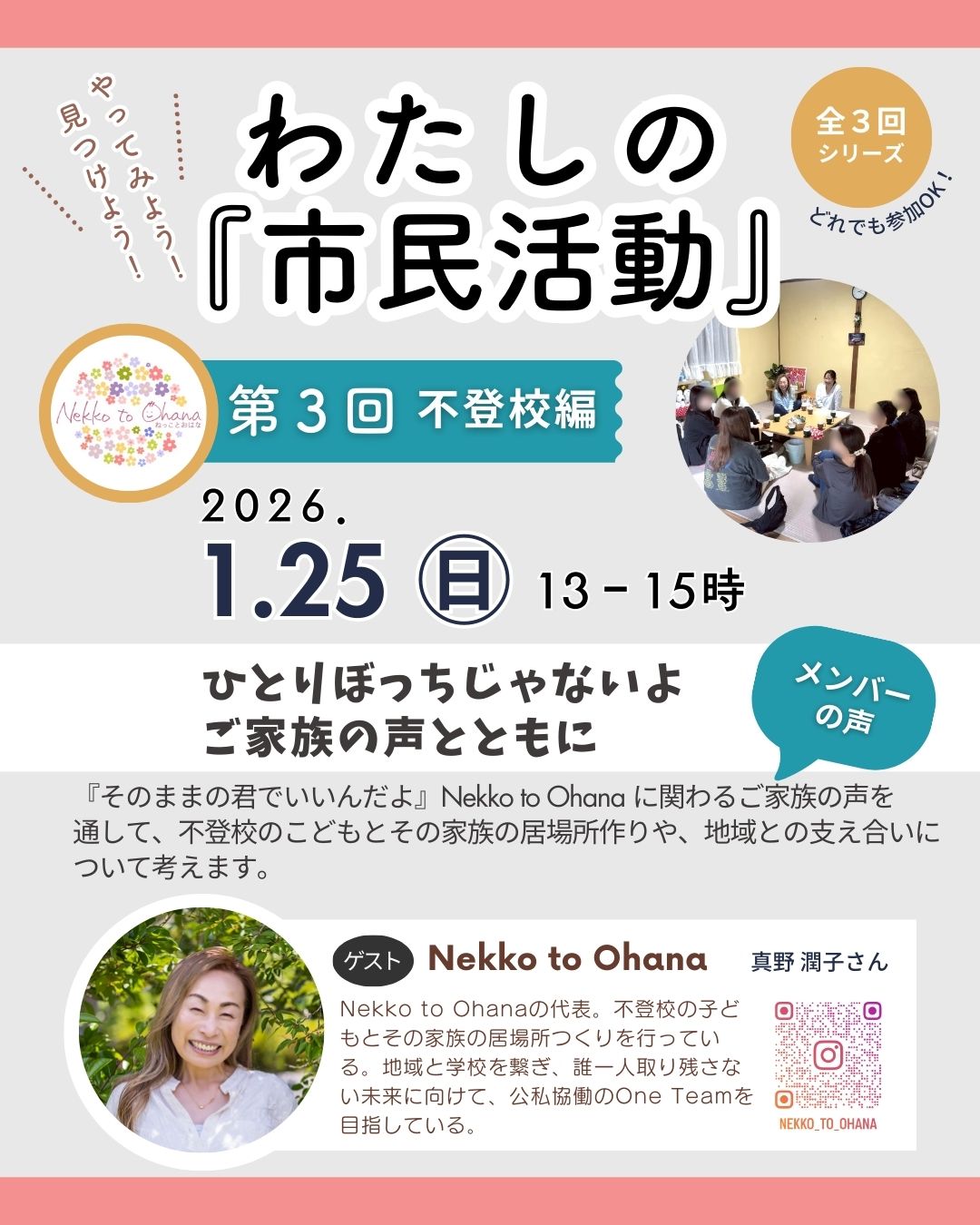 #市民活動 #地域活動 #やってみたい #仲間づくり #池田市 #Nekko to Ohana #不登校 #不登校の親 #共感できる場所 #安心できる場所 #不登校支援 #いきしぶり #行き渋り #別室登校 #支えて応援 #子育て #市民企画講座 #池田市立市民活動交流センター
